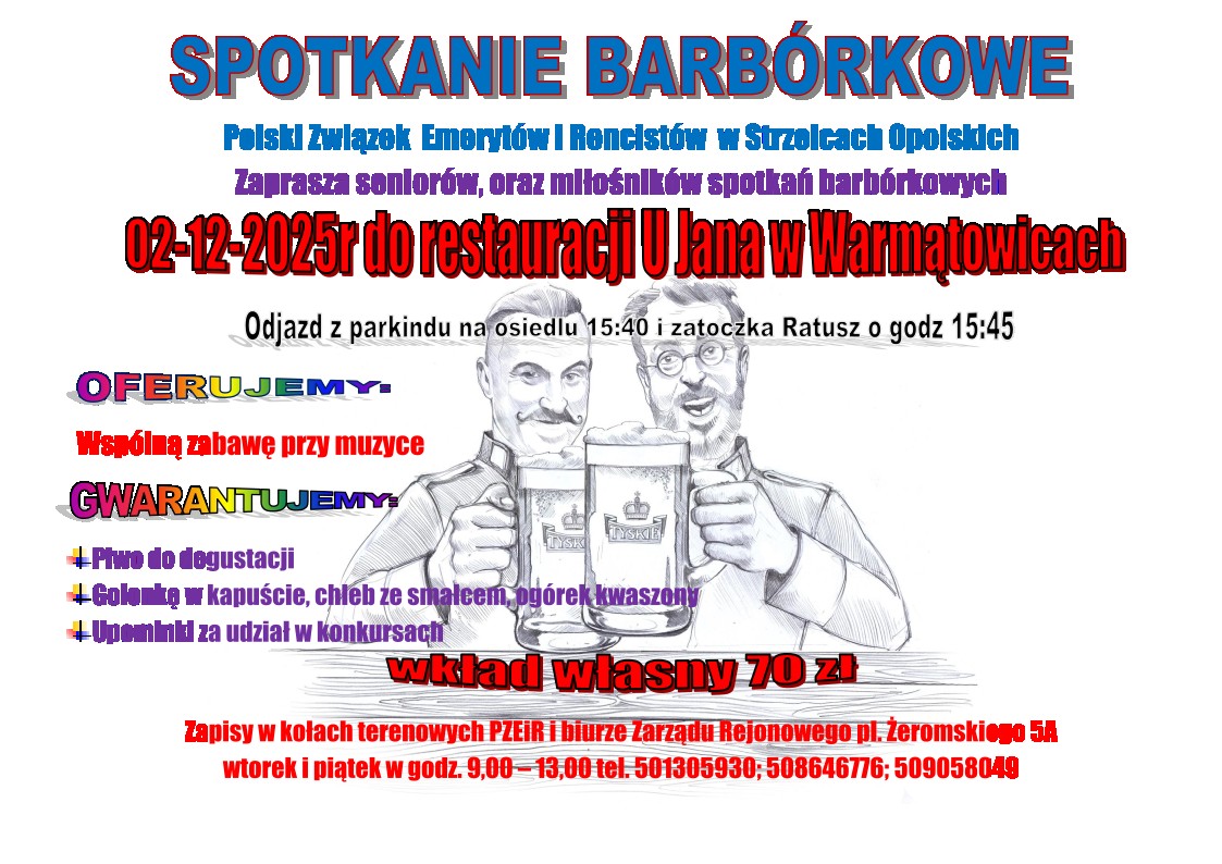 Zarząd Oddziału Rejonowego Polskiego Związku Emerytów i Rencistów w Strzelcach Opolskich zaprasza wszystkich Panów – emerytów naszego Związku oraz sympatyków tradycji górniczych – na Spotkanie Barbórkowe, które odbędzie się 2 grudnia 2025 r. w restauracji „U Jana”. Warmątowice.